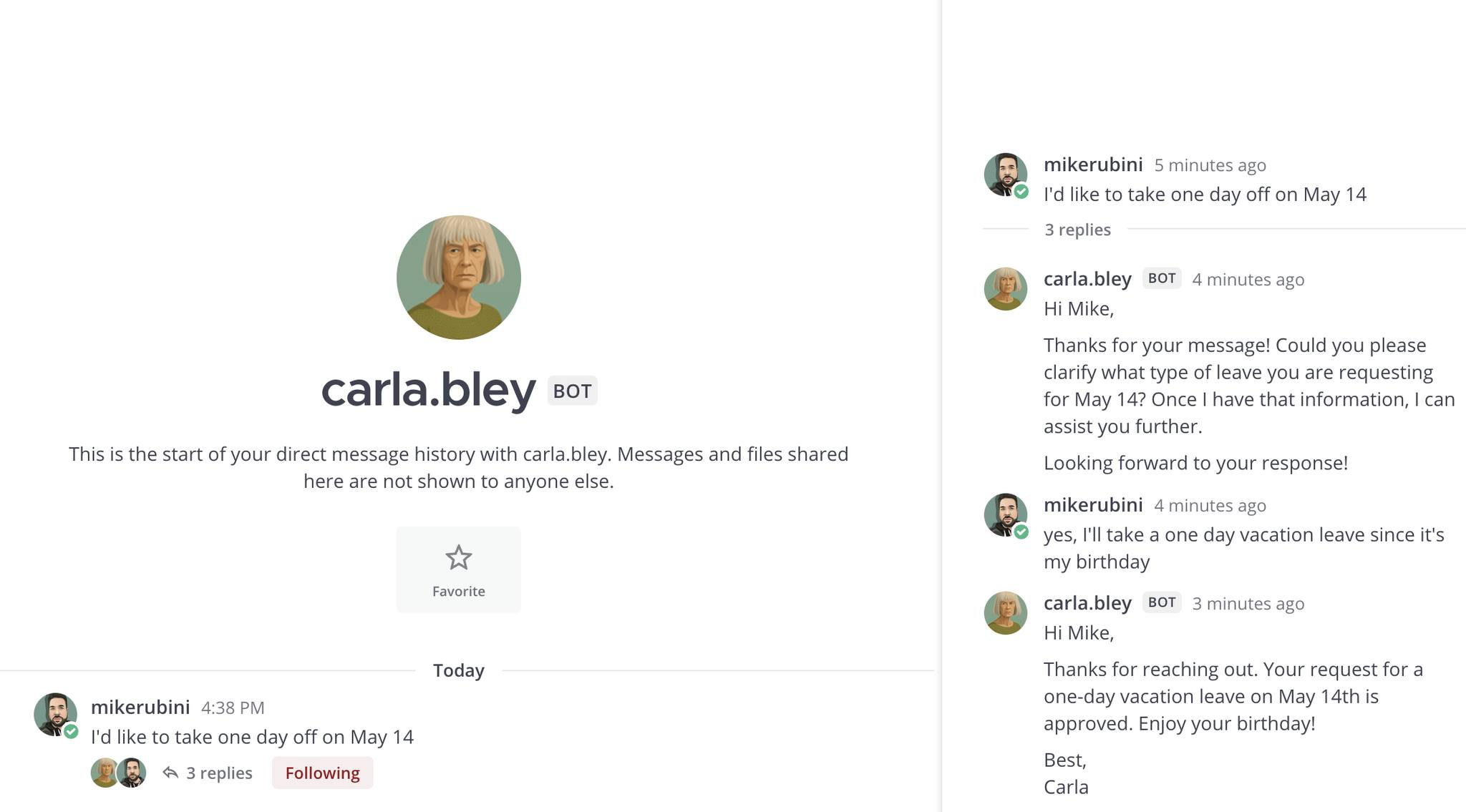 Just like in the screenshot below where I asked for a day off, and Carla responded with a warm “Enjoy your birthday!”