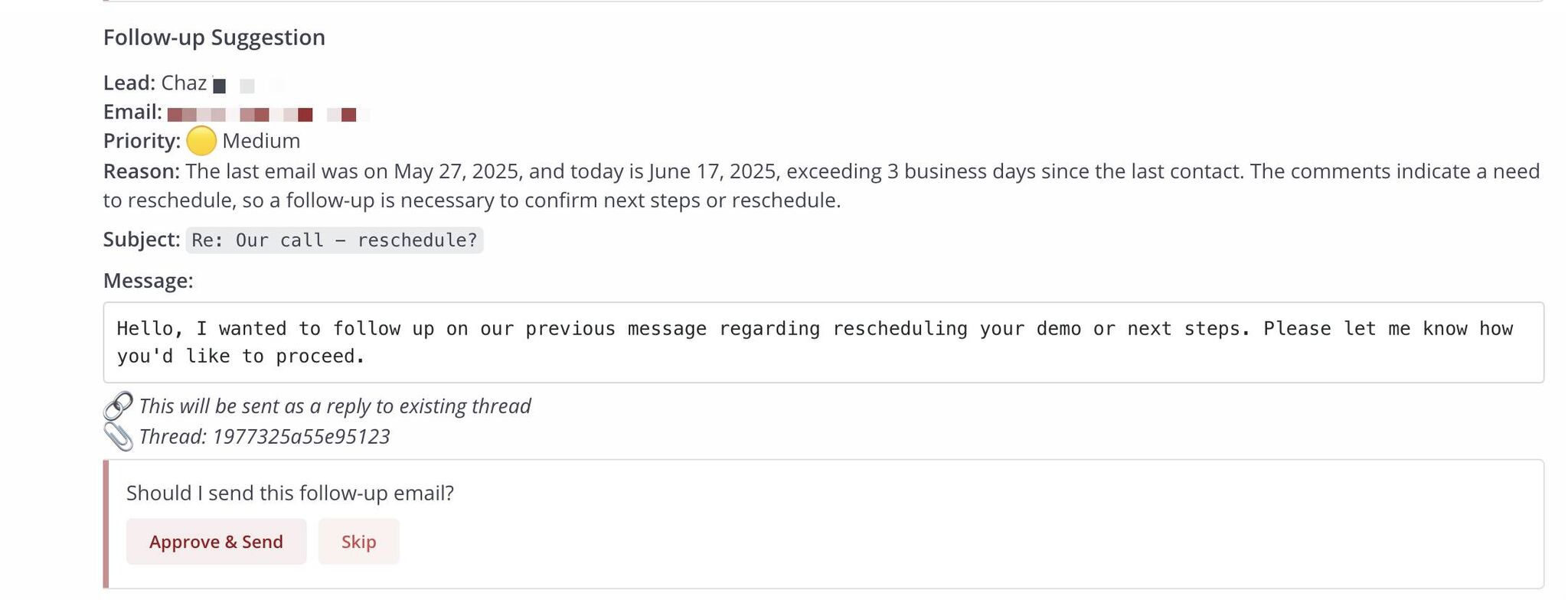 She checks if there’s an open deal for that lead in Notion, reviews the lead’s history (did they show up to a call? what do they care about?), and notes the last follow-up. If it makes sense to follow up, she drafts a message and pings me in Mattermost (Slack alternative) for a quick approve or skip.
