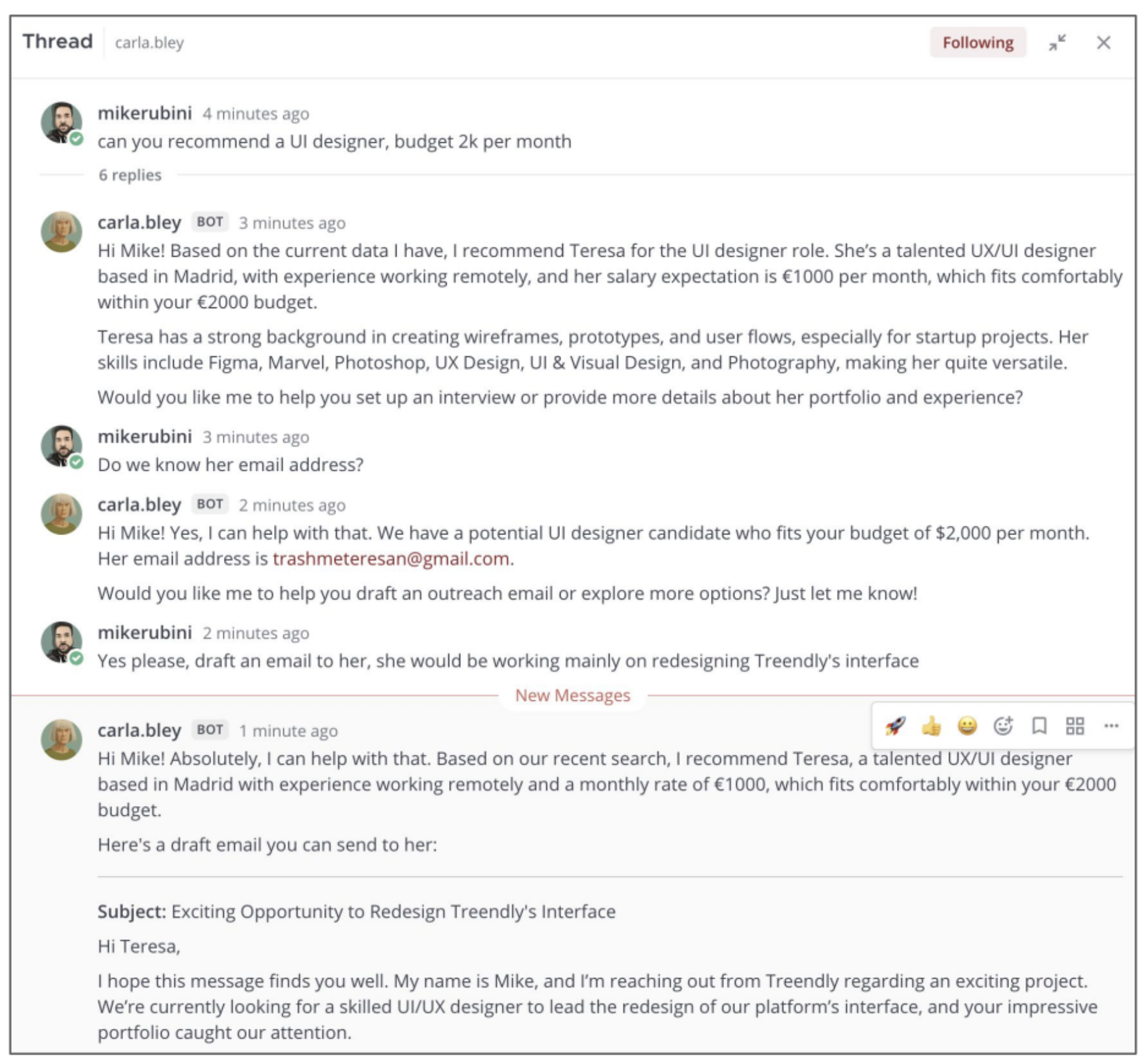Need to find a UI designer within a certain budget? Carla shortlists candidates, drafts outreach emails, and even provides bios. In one thread, she recommended a designer named Teresa, wrote a full cold email, and asked if I wanted to approve it before sending. That’s an entire recruiting loop, closed.