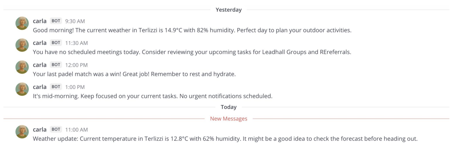 Her proactivity is what stands out. All of my agents need to be proactive. Carla auto-schedules notifications based on events happening during the day. If she sees I have no scheduled meetings, she suggests reviewing tasks for key projects. If I win a padel match, she reminds me to hydrate. Yes, really.