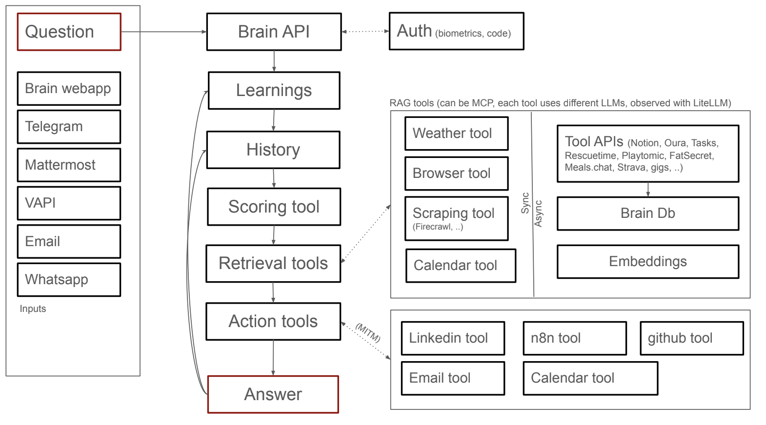 Core Processing Flow: The system starts with a user question that gets processed by a central Brain API. This API coordinates the entire workflow through several sequential stages: Learnings → History → Scoring tool → Retrieval tools → Action tools → Answer.
